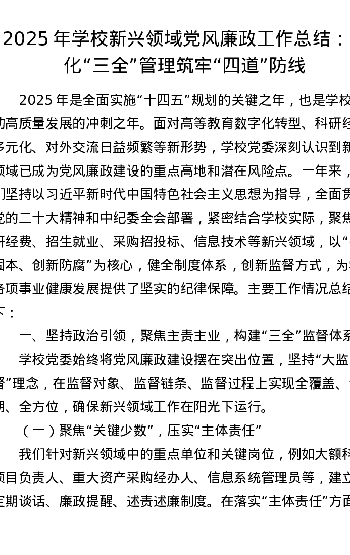 2025年学校新兴领域党风廉政工作总结:深化“三全”管理 筑牢“四道”防线