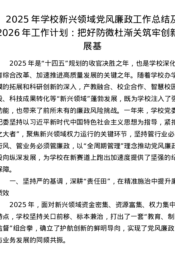 2025年学校新兴领域党风廉政工作总结及2026年工作计划:把好防微杜渐关 筑牢创新发展基