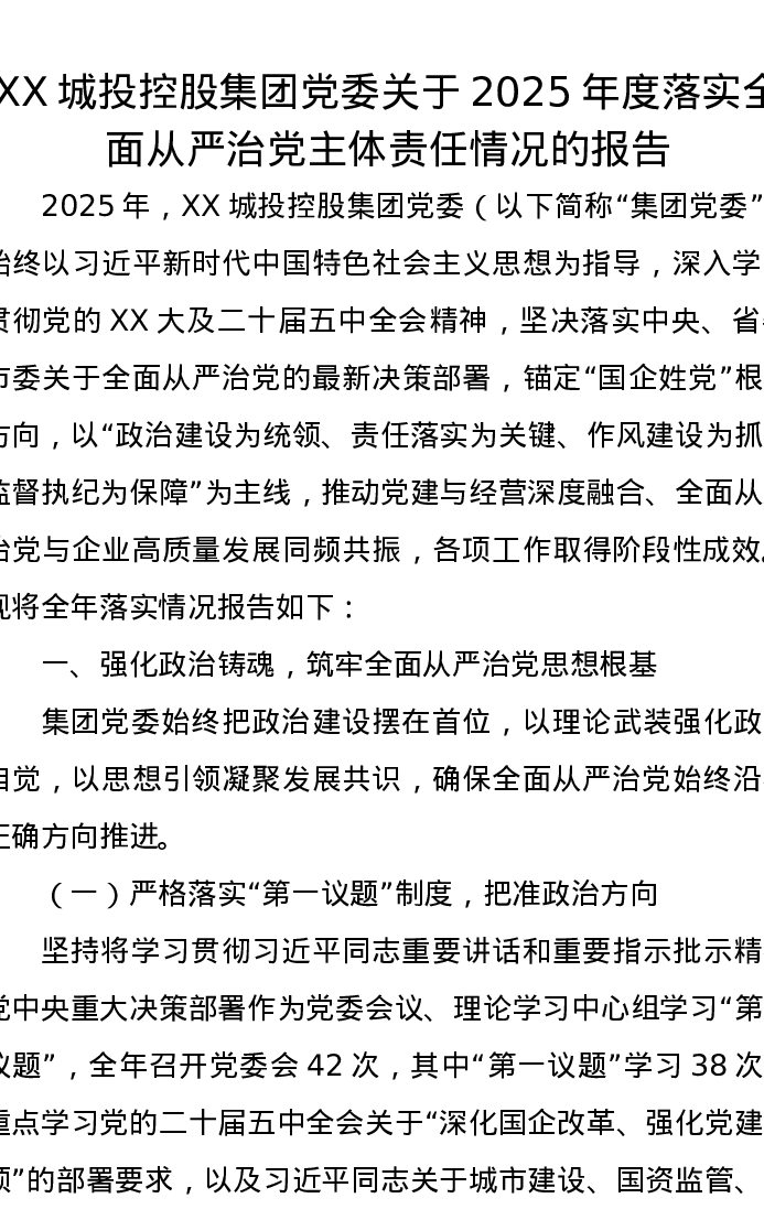 XX城投控股集团党委关于2025年度落实全面从严治党主体责任情况的报告