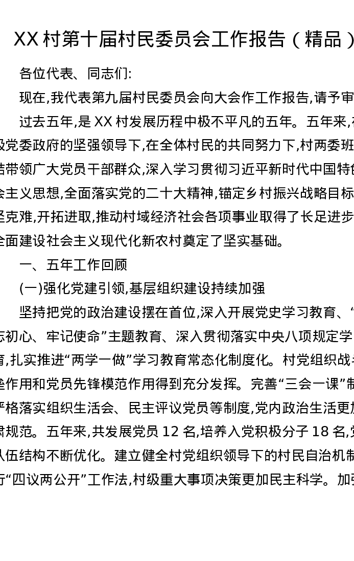 XX村第十届村民委员会工作报告