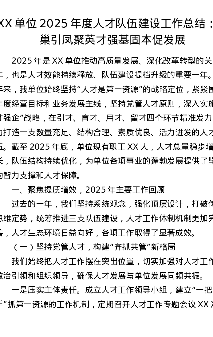 XX单位2025年度人才队伍建设工作总结:筑巢引凤聚英才 强基固本促发展