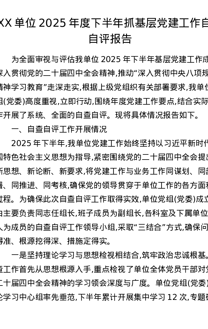 XX单位2025年度下半年抓基层党建工作自查自评报告