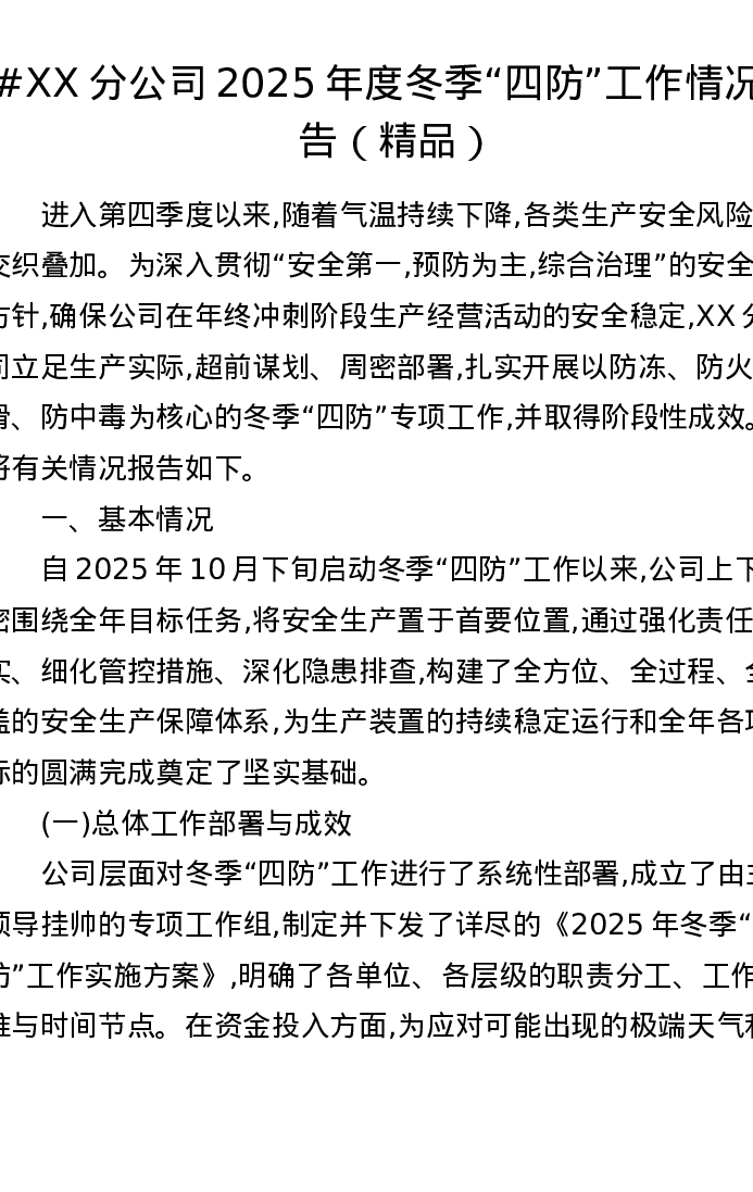 XX分公司2025年度冬季“四防”工作情况报告