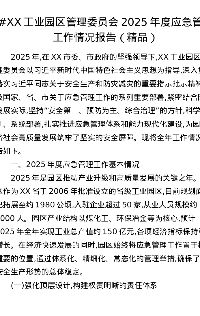 XX工业园区管理委员会2025年度应急管理工作情况报告
