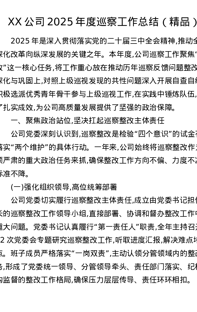 XX公司2025年度巡察工作总结