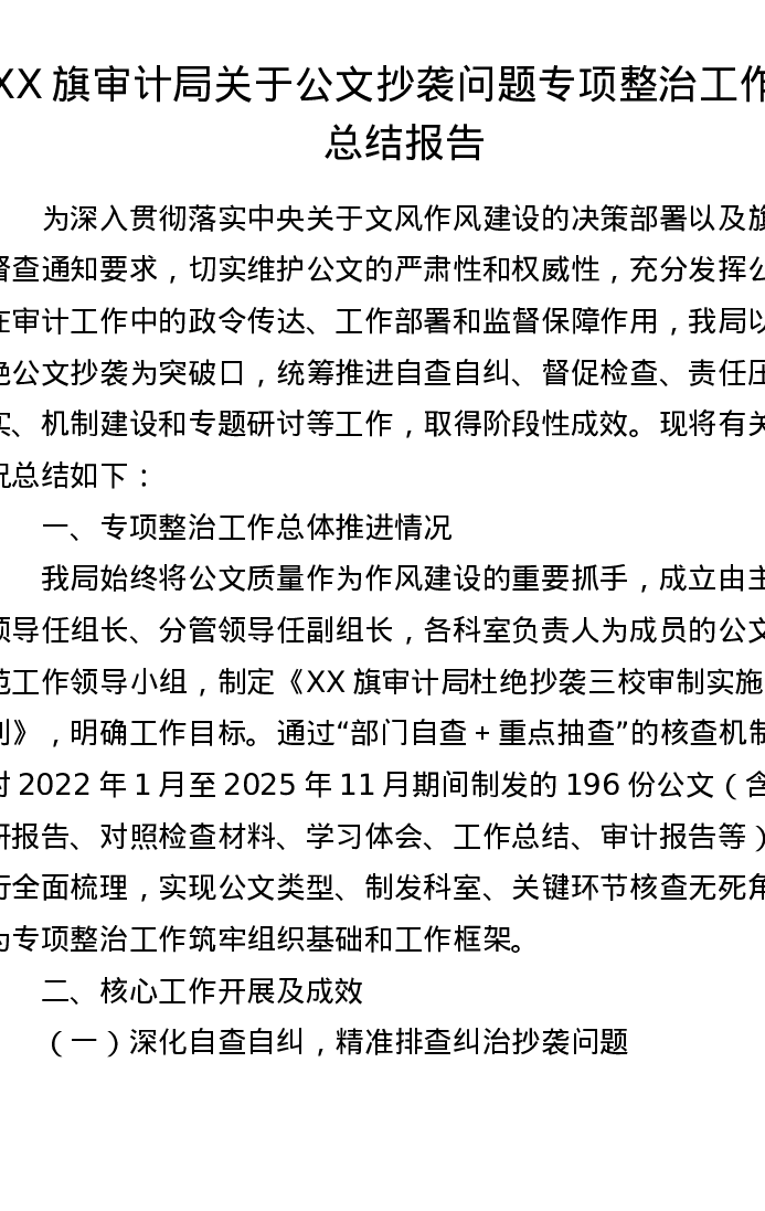 XX旗审计局关于公文抄袭问题专项整治工作的总结报告