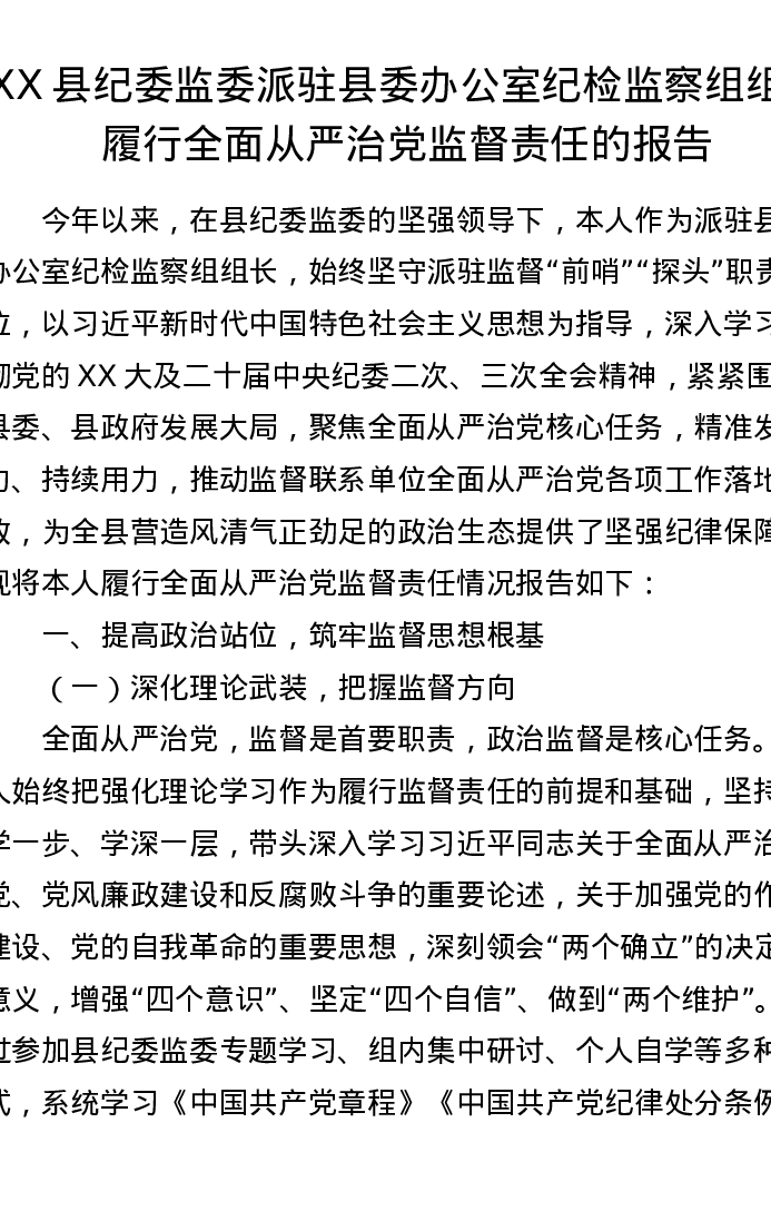 XX县纪委监委派驻县委办公室纪检监察组组长履行全面从严治党监督责任的报告