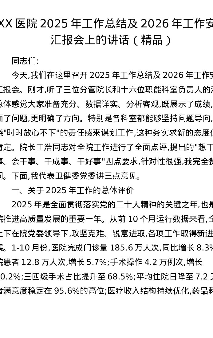 XX医院2025年工作总结及2026年工作安排汇报会上的讲话