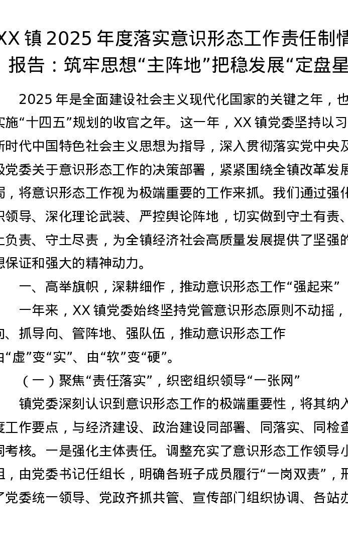 XX镇2025年度落实意识形态工作责任制情况报告:筑牢思想“主阵地” 把稳发展“定盘星”