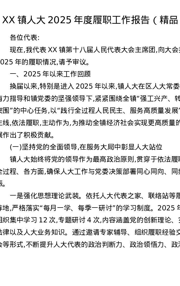 XX镇人大2025年度履职工作报告