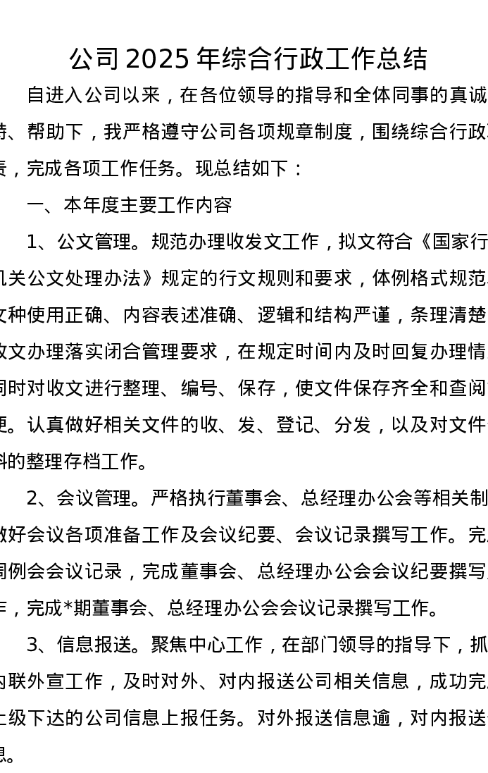 公司2025年综合行政工作总结