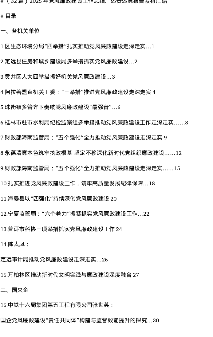 汇编:2025年党风廉政建设工作总结、述责述廉报告素材32篇