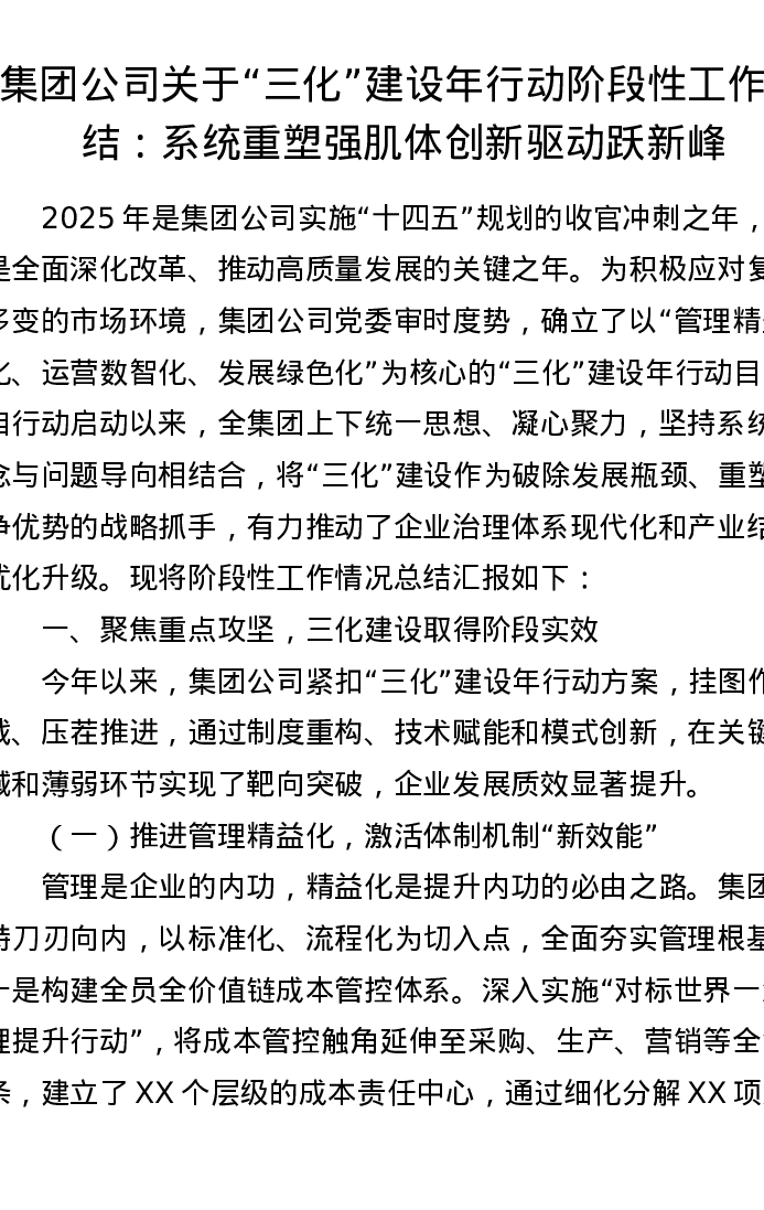 集团公司关于“三化”建设年行动阶段性工作总结:系统重塑强肌体 创新驱动跃新峰