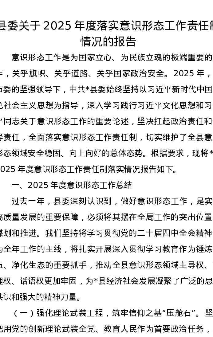 县委关于2025年度落实意识形态工作责任制情况的报告