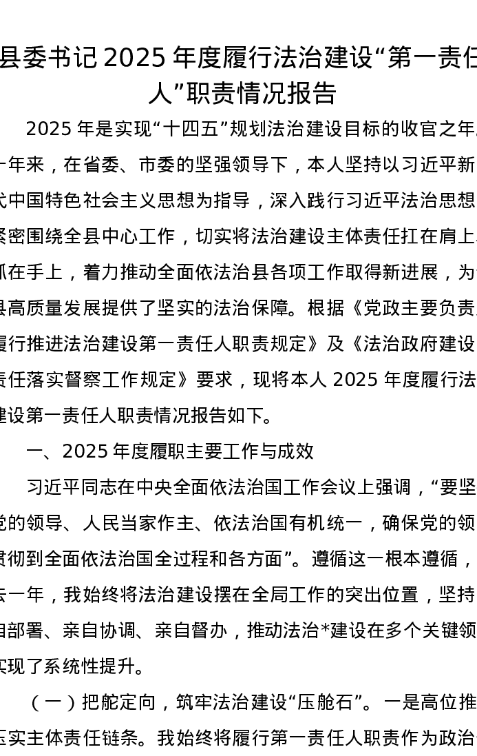 县委书记2025年度履行法治建设“第一责任人”职责情况报告