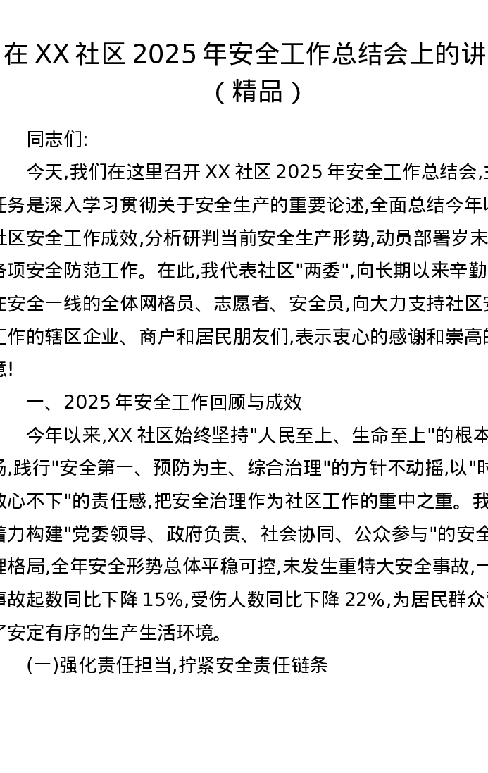 在XX社区2025年安全工作总结会上的讲话