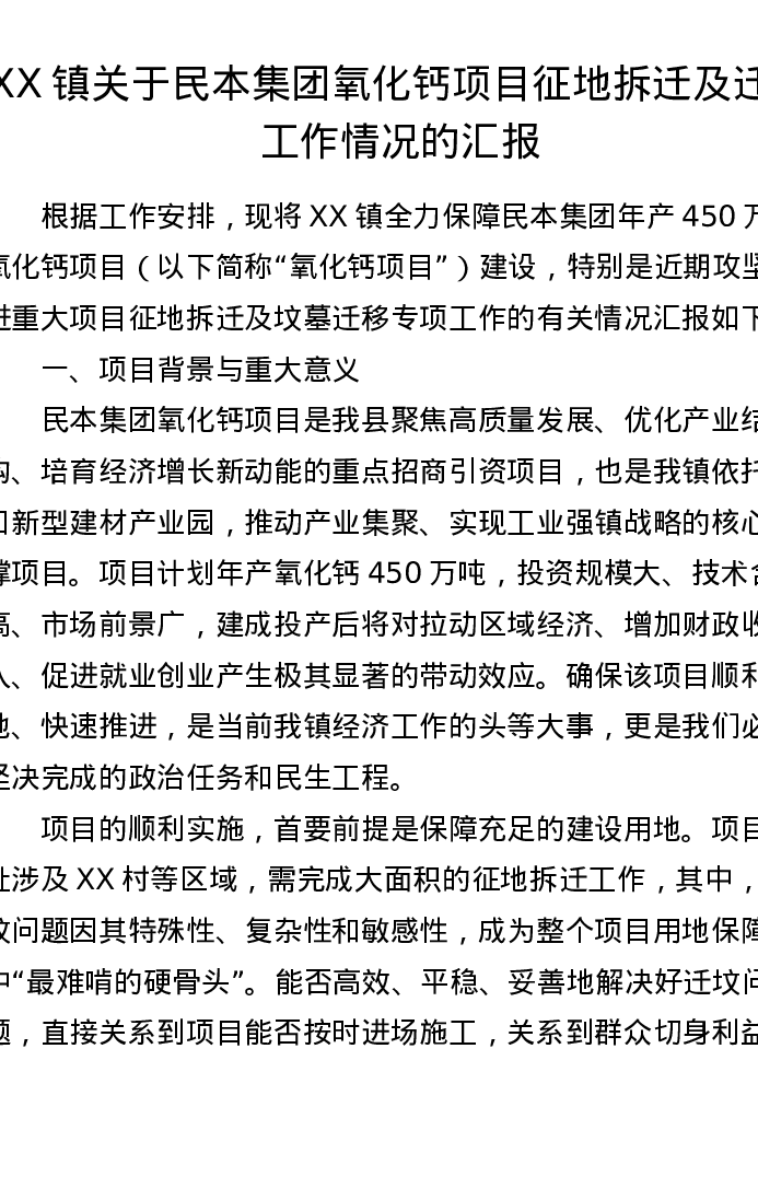 XX镇关于民本集团氧化钙项目征地拆迁及迁坟工作情况的汇报