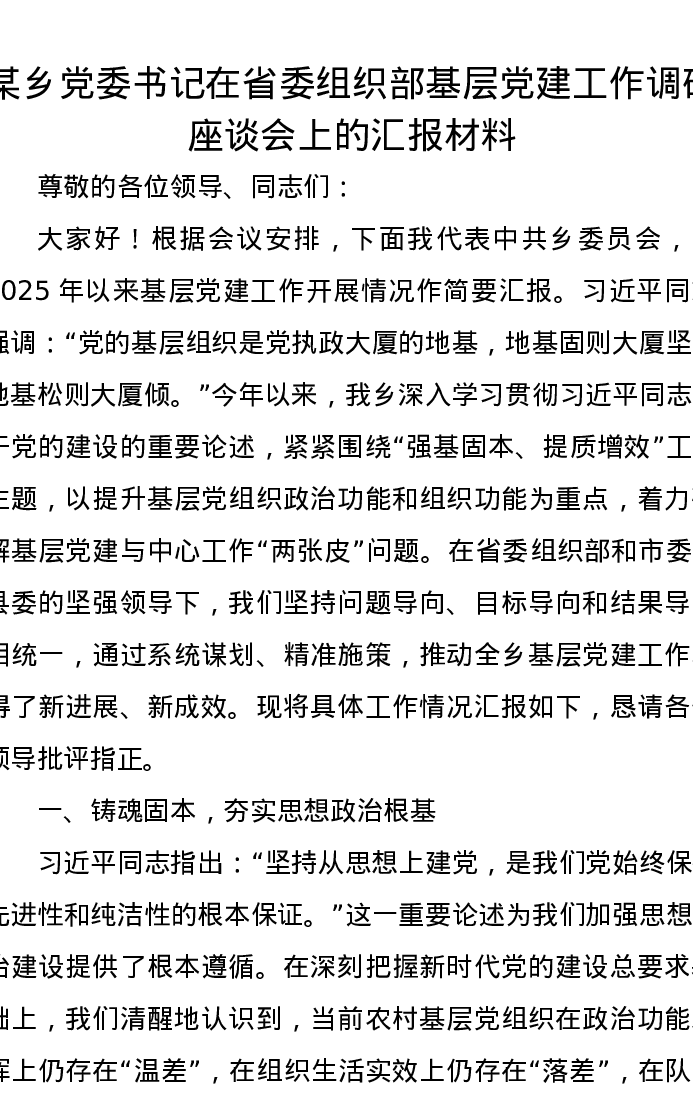 某乡党委书记在省委组织部基层党建工作调研座谈会上的汇报材料