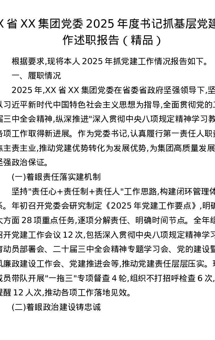 XX省XX集团党委2025年度书记抓基层党建工作述职报告