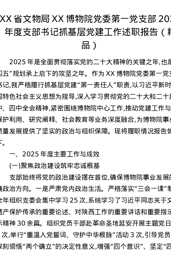 XX省文物局XX博物院党委第一党支部2025年度支部书记抓基层党建工作述职报告