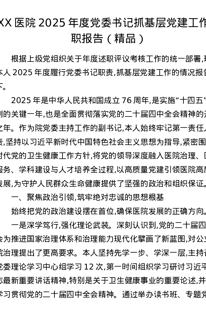 XX医院2025年度党委书记抓基层党建工作述职报告