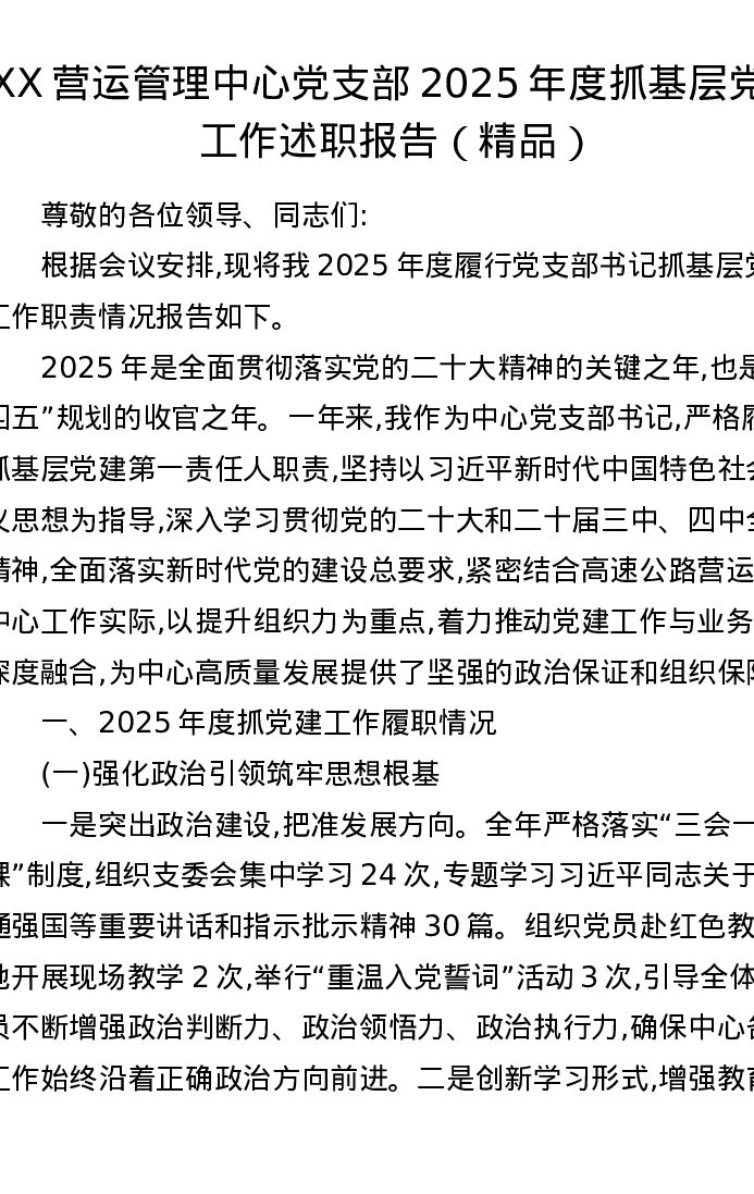 XX营运管理中心党支部2025年度抓基层党建工作述职报告