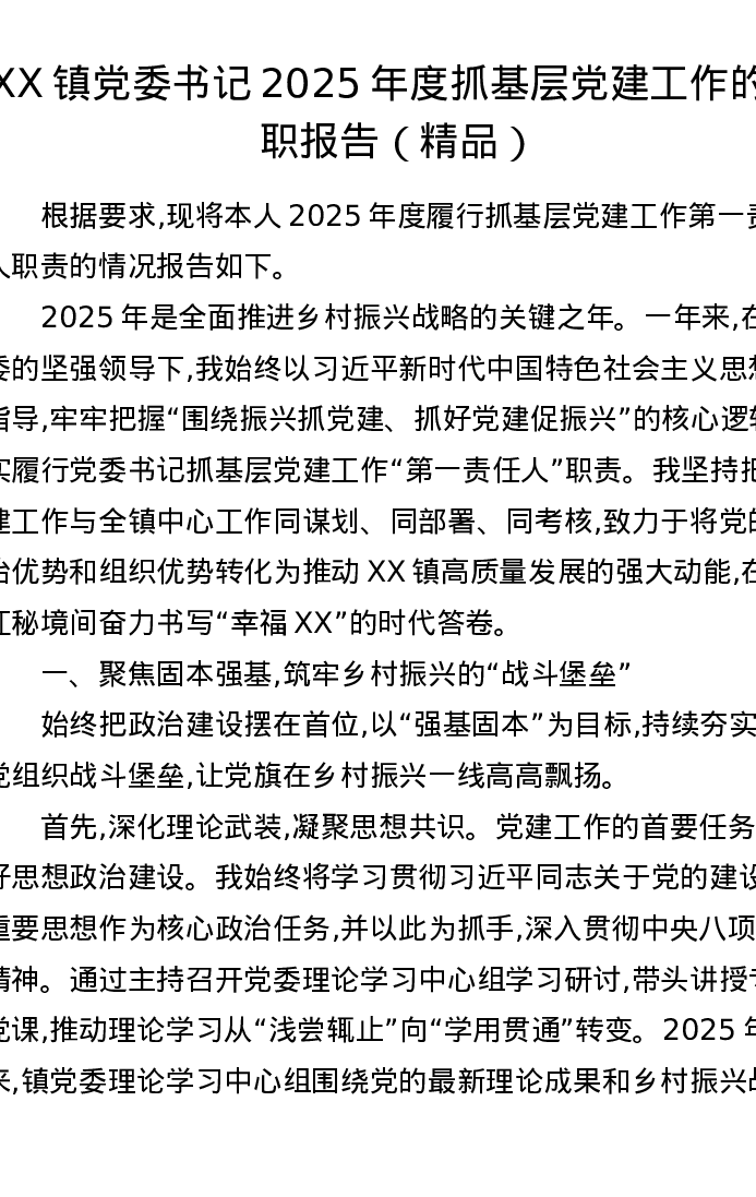 XX镇党委书记2025年度抓基层党建工作的述职报告