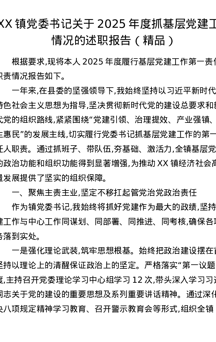 XX镇党委书记关于2025年度抓基层党建工作情况的述职报告
