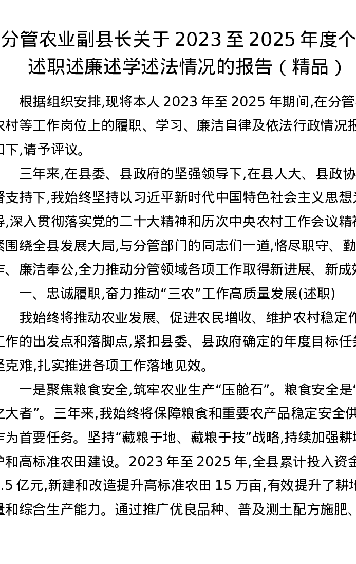 分管农业副县长关于2023至2025年度个人述职述廉述学述法情况的报告