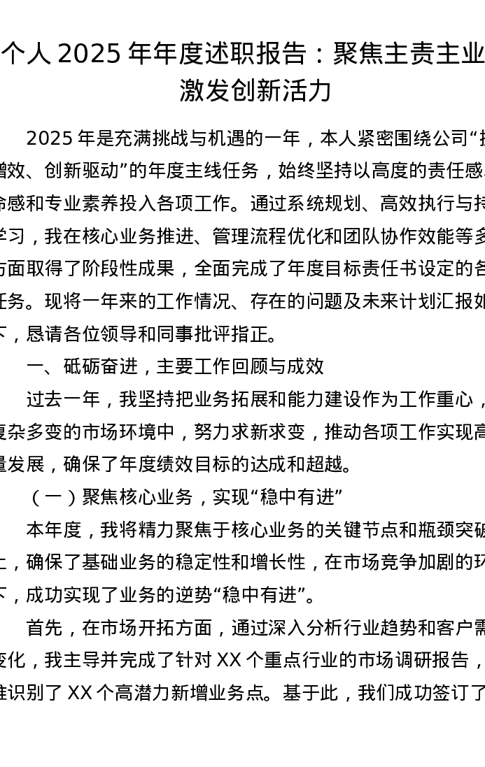 个人2025年年度述职报告:聚焦主责主业,激发创新活力