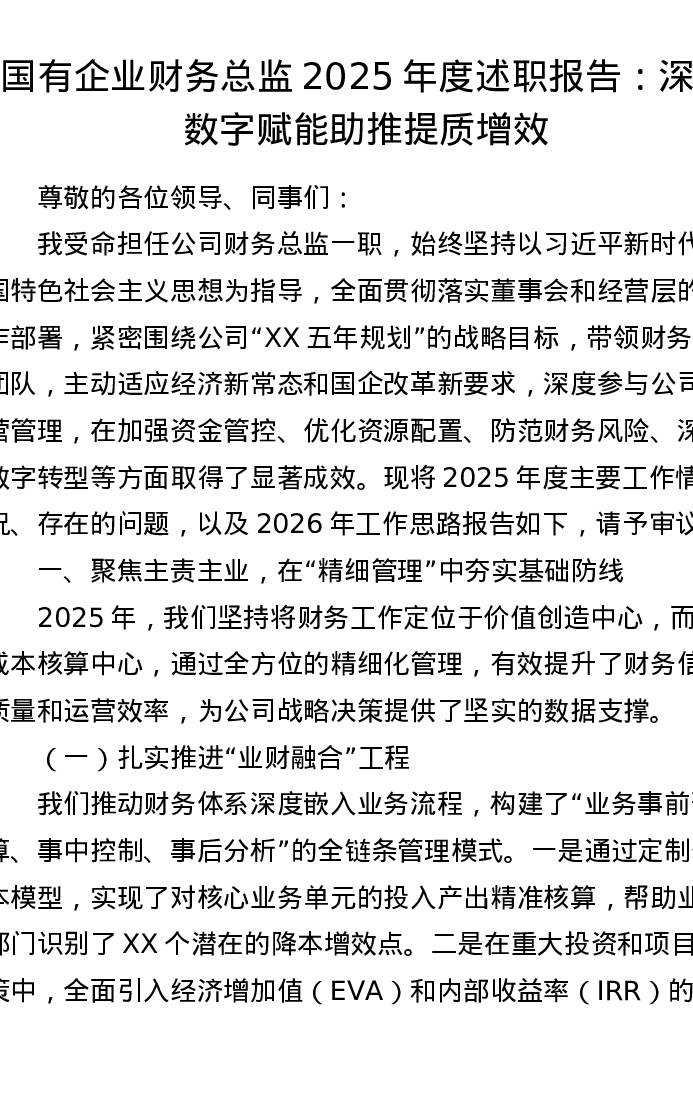 国有企业财务总监2025年度述职报告:深化数字赋能 助推提质增效
