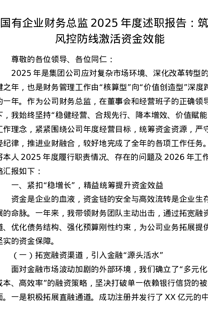 国有企业财务总监2025年度述职报告:筑牢风控防线 激活资金效能