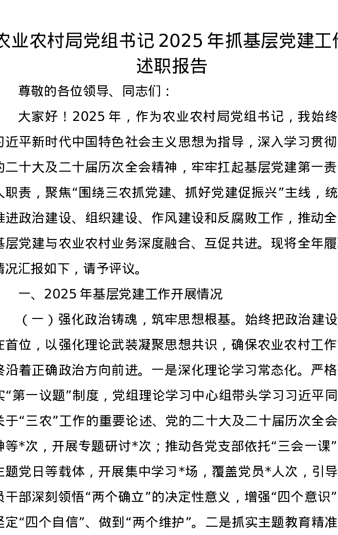 农业农村局党组书记2025年抓基层党建工作述职报告