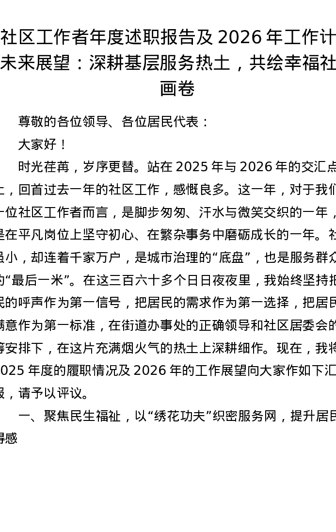 社区工作者年度述职报告及2026年工作计划未来展望:深耕基层服务热土,共绘幸福社区画卷