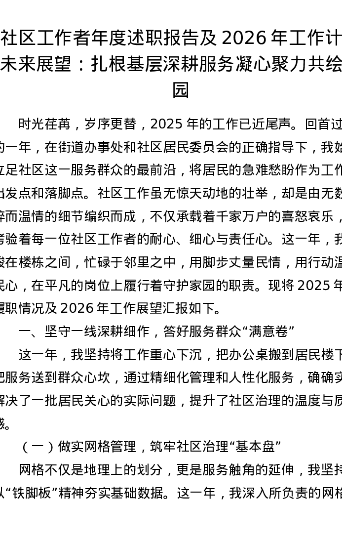 社区工作者年度述职报告及2026年工作计划未来展望:扎根基层深耕服务 凝心聚力共绘家园