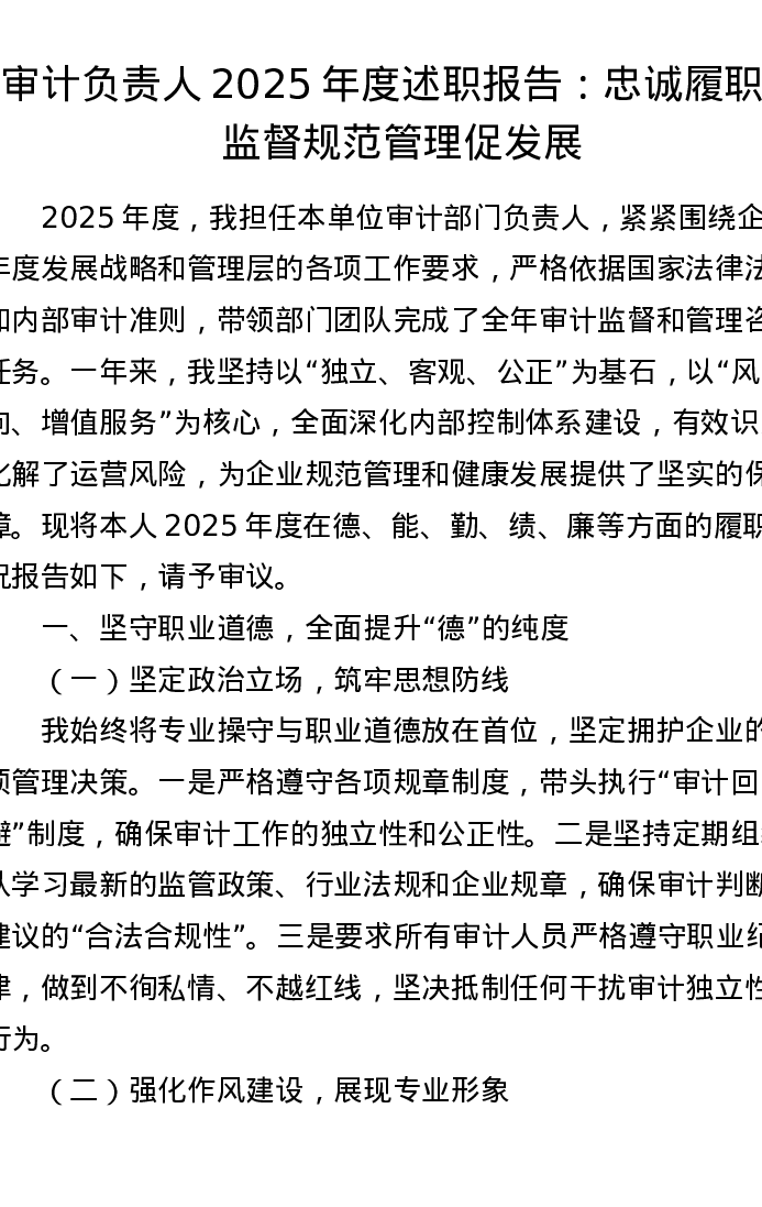 审计负责人2025年度述职报告:忠诚履职强监督 规范管理促发展