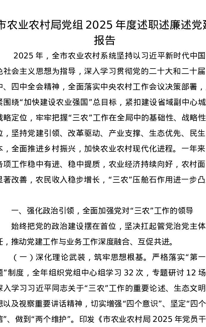 市农业农村局党组2025年度述职述廉述党建报告