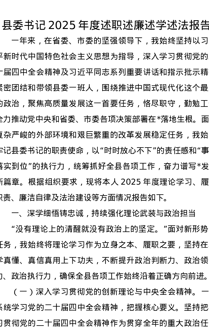县委书记2025年度述职述廉述学述法报告