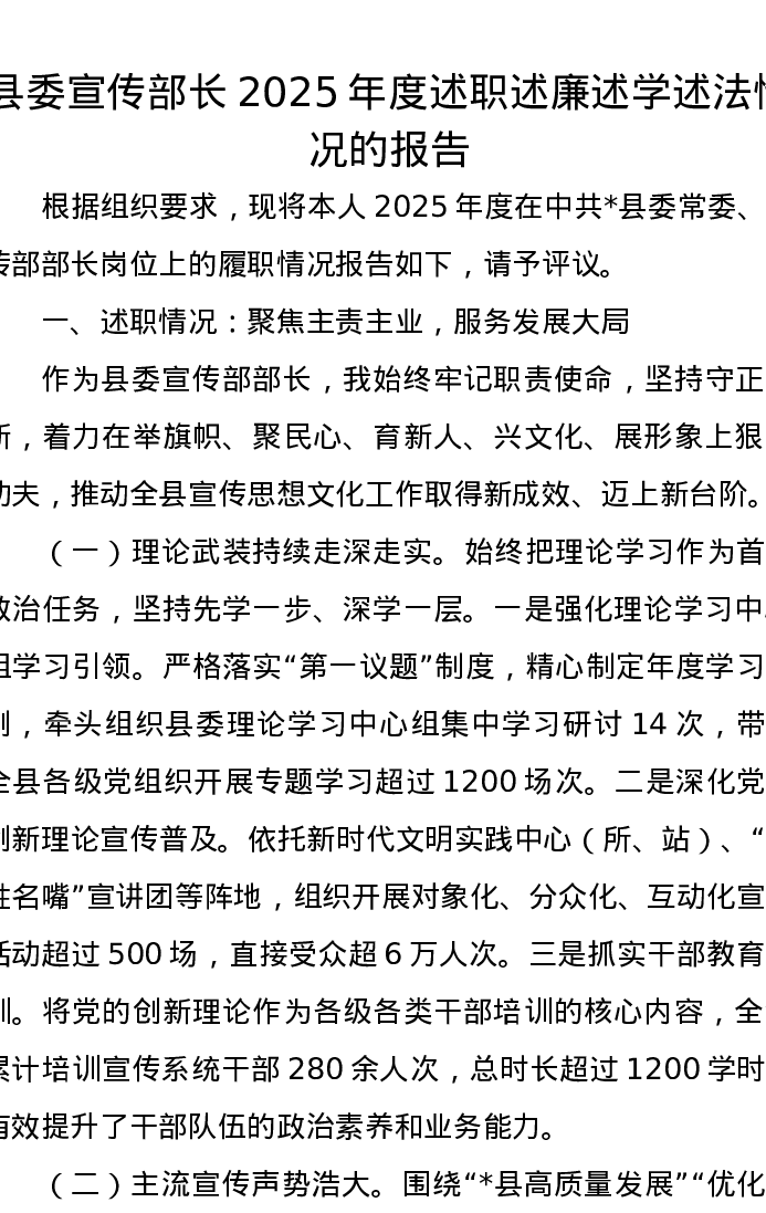 县委宣传部长2025年度述职述廉述学述法情况的报告
