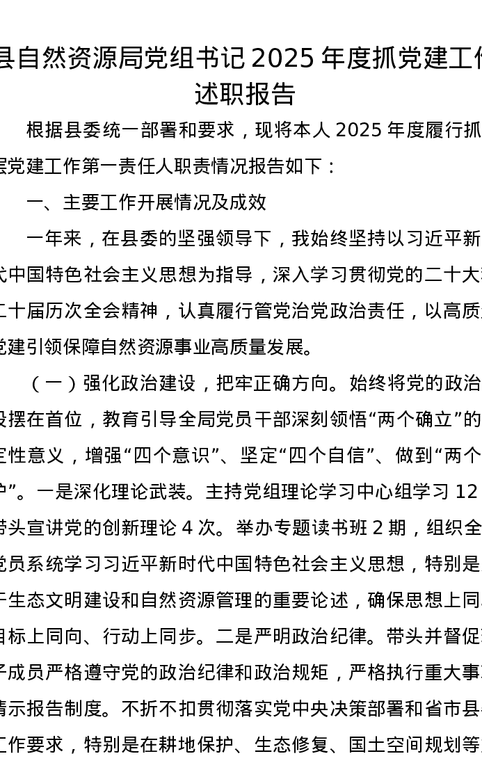 县自然资源局党组书记2025年度抓党建工作述职报告