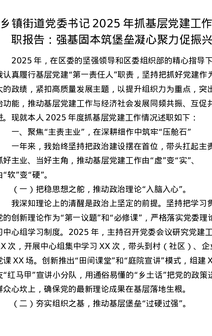 乡镇街道党委书记2025年抓基层党建工作述职报告:强基固本筑堡垒 凝心聚力促振兴