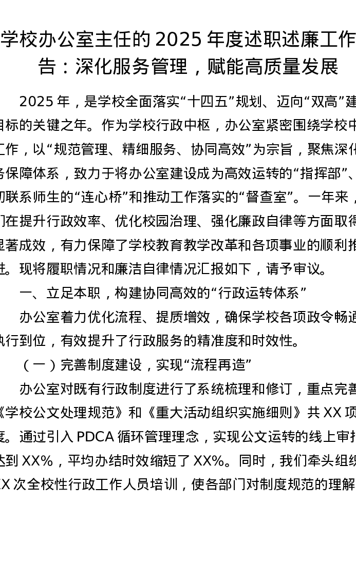 学校办公室主任的2025年度述职述廉工作报告:深化服务管理,赋能高质量发展