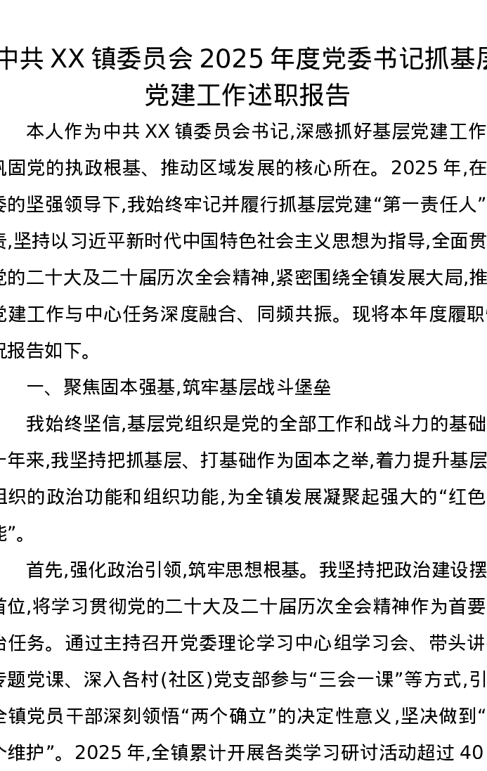 中共XX镇委员会2025年度党委书记抓基层党建工作述职报告