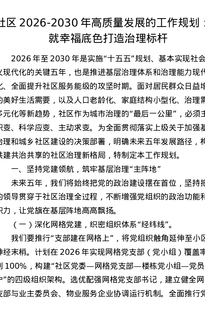 社区2026-2030年高质量发展的工作规划:绘就幸福底色 打造治理标杆