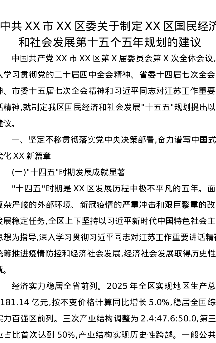中共XX市XX区委关于制定XX区国民经济和社会发展第十五个五年规划的建议1