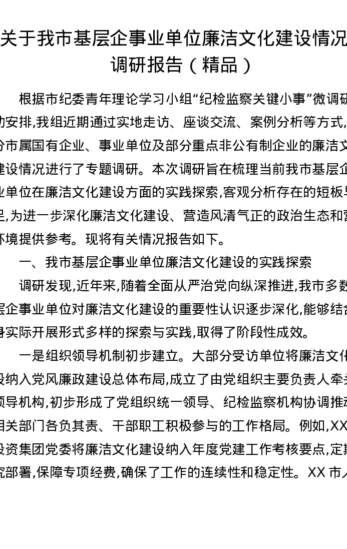 关于我市基层企事业单位廉洁文化建设情况的调研报告
