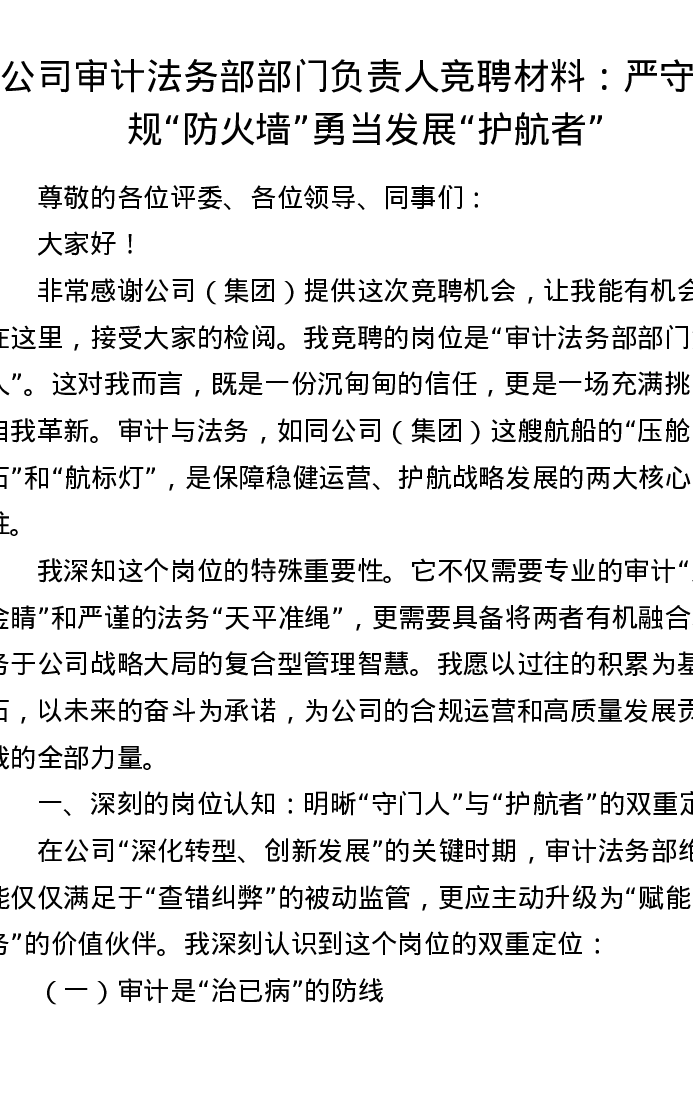 公司审计法务部部门负责人竞聘材料:严守合规“防火墙” 勇当发展“护航者”