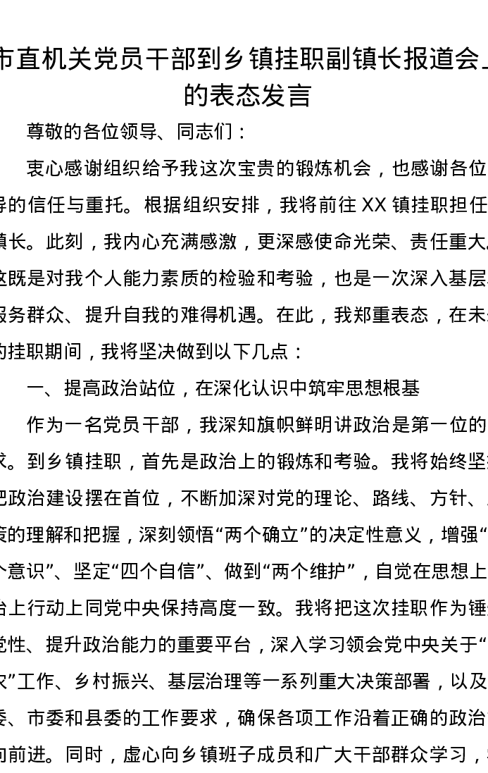 市直机关党员干部到乡镇挂职副镇长报道会上的表态发言