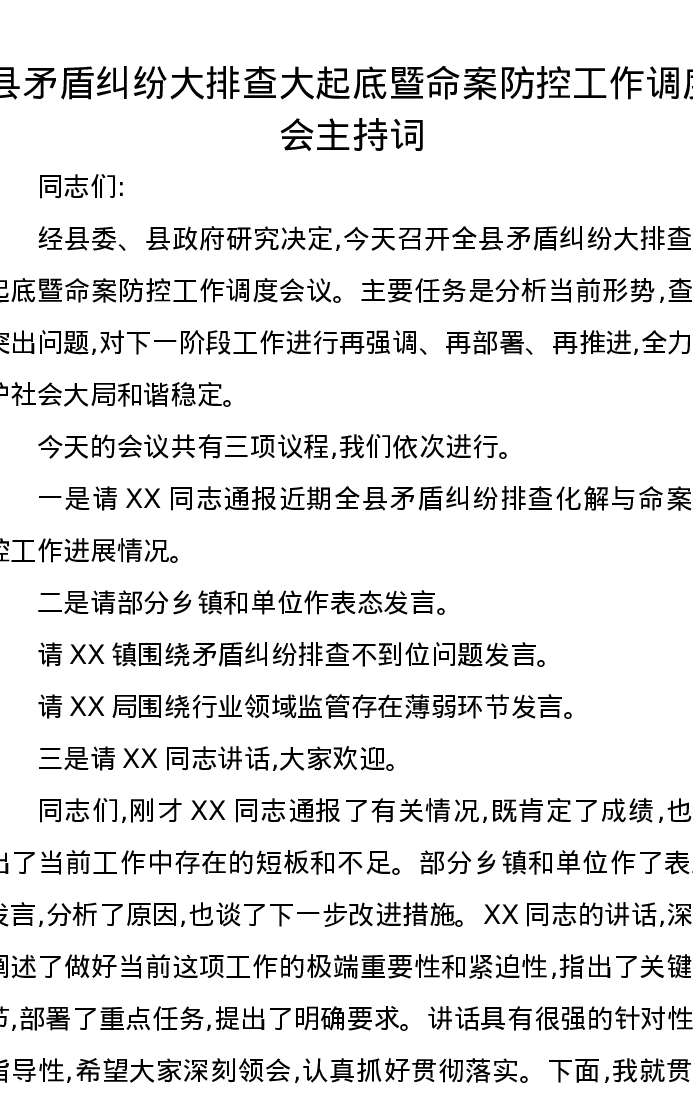 县矛盾纠纷大排查大起底暨命案防控工作调度会主持词