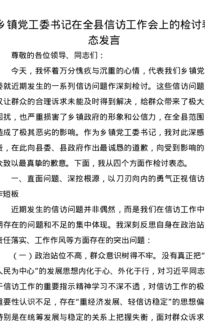 乡镇党工委书记在全县信访工作会上的检讨表态发言